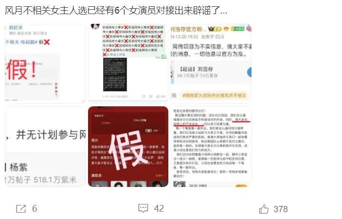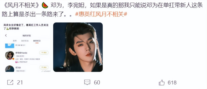 网友们都非常好奇,邓为会和哪位女演员合作,然后网上陆续传出多位女演员要接《风月不相关》的消息,如:梁洁、刘浩存、杨紫、迪丽热巴、田曦薇、杨超越等等,让大家没想到的是,多位女演员的对接都否认要接《风月不相关》,而“杨超越对接辟谣出演风月不相关”话题还登上热搜。